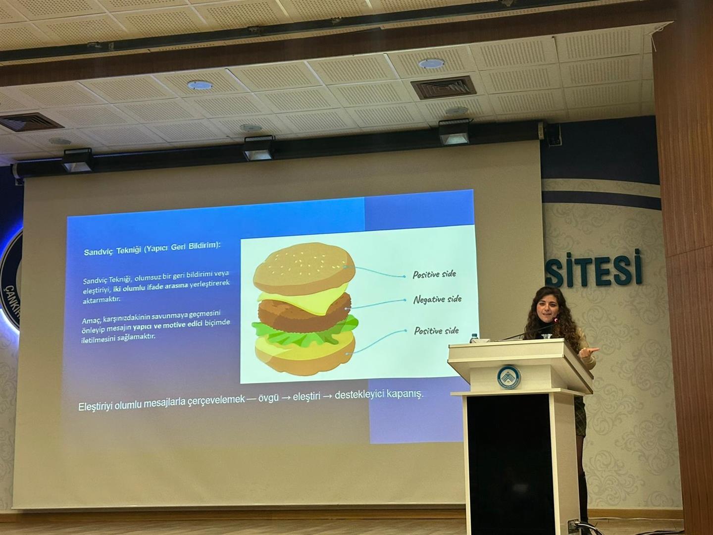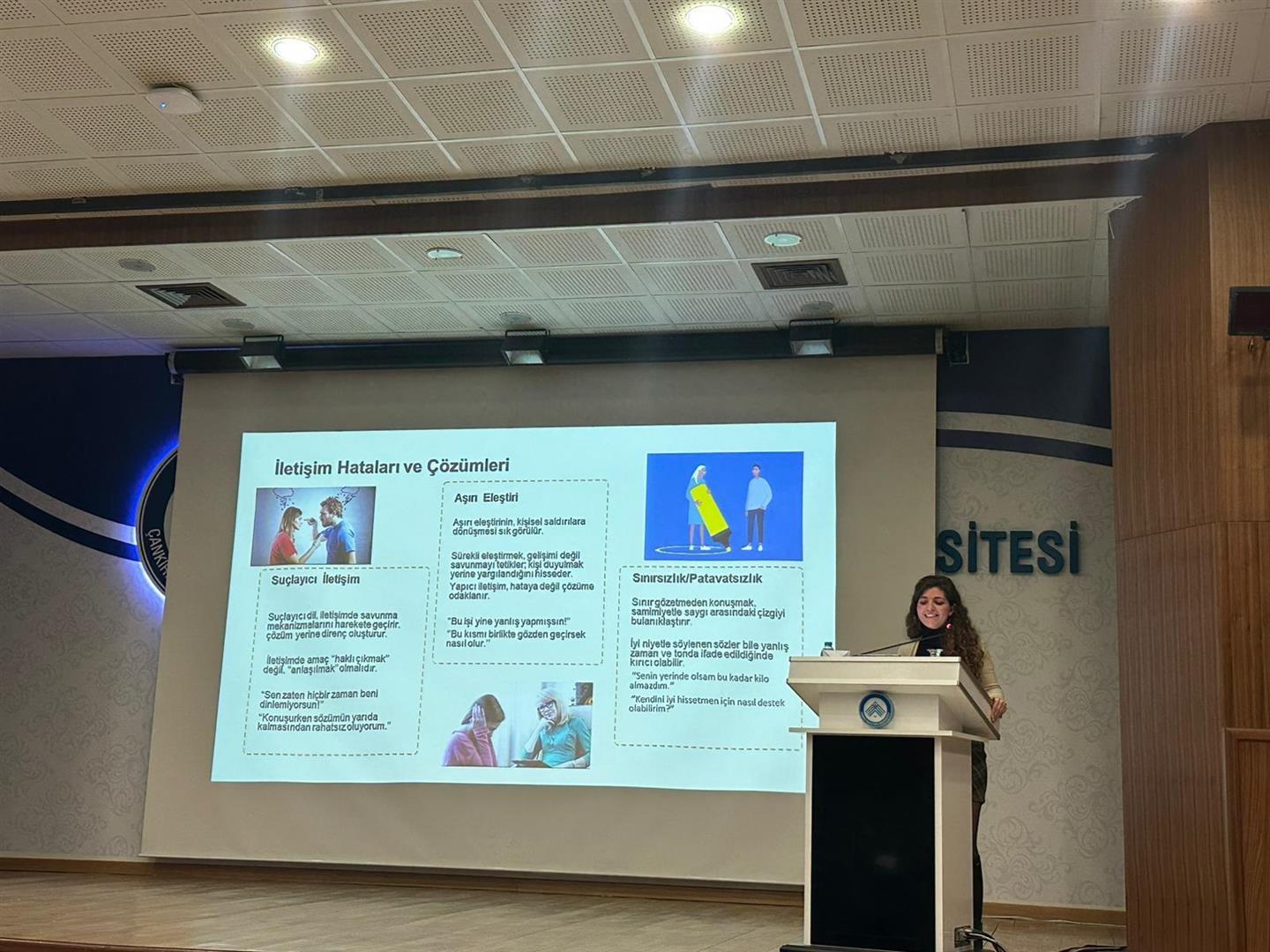 Üniversitemiz Hizmet İçi Eğitim Yönergesi ile 2025 Yılı Hizmet İçi Eğitim Planı kapsamında 07.11.2025 tarihinde Üniversitemizde görev yapmakta olan personele yönelik (Akademik/İdari /Sözleşmeli Personel, Sürekli İşçi) Rektörlük Konferans Salonunda İletişim Becerileri Eğitimi bölüm araştırma görevlimiz Cemrenur Karaaslan tarafından verilmiştir.